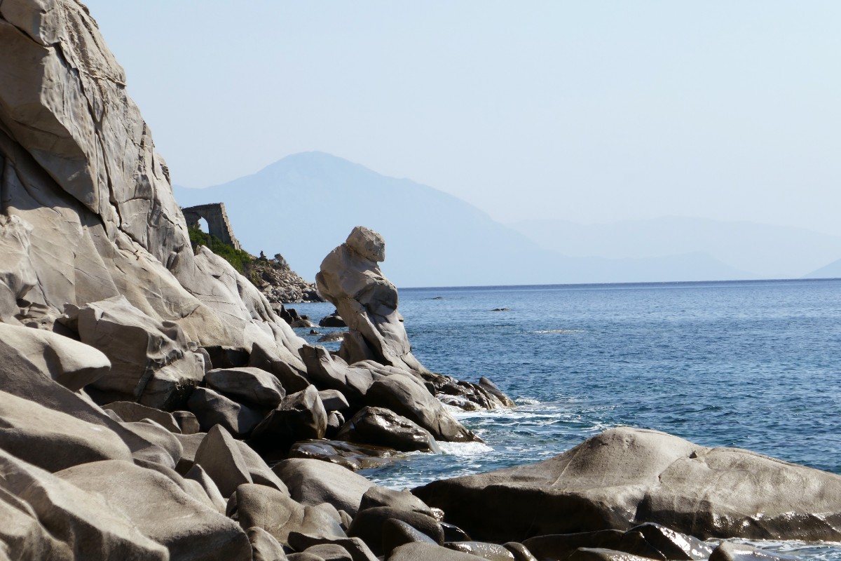 Ikaria ist ein Pultberg, der zu seiner Südküste steil abfällt. Der Weg windet sich nun steil zwischen Felsen und später durch Erdbeerbäume und Pinien hinunter zur stets sichtbaren Küste von Manganitis. Dort wartet das Bad im tiefblauen Meer. Später bringt der Bus die müden Wanderer auf der neuen Strasse über das Atheras-Gebirge zurück an die liebliche Nordküste, nach Armenistis.
