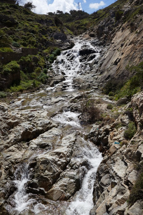 Die Höhe haltend geht es in ein Tal, in dem terrassierte Felder, Bewässerungskanäle und Häuser ohne Däche von einer Zeit zeugen, in der auf der Insel jede verfügbare Ackerfläche genutzt wurde, um die zu vielen Menschen zu ernähren. Ikaria war bis Ende des letzten Jahrhunderts eine Insel der Auswanderung. Bevorzugtes Ziel waren die USA, genauer gesagt Pittsburgh mit seiner Stahlindustrie. Zumeist gingen die Männer. Im Zweiten Weltkrieg, als die Insel von den Italienern und den Deutschen besetzt war, versiegten die Zahlungen. In Ikaria herrschte grosse Not. Wer die Insel nicht verlassen konnte litt Hunger, zahlreiche Menschen starben.