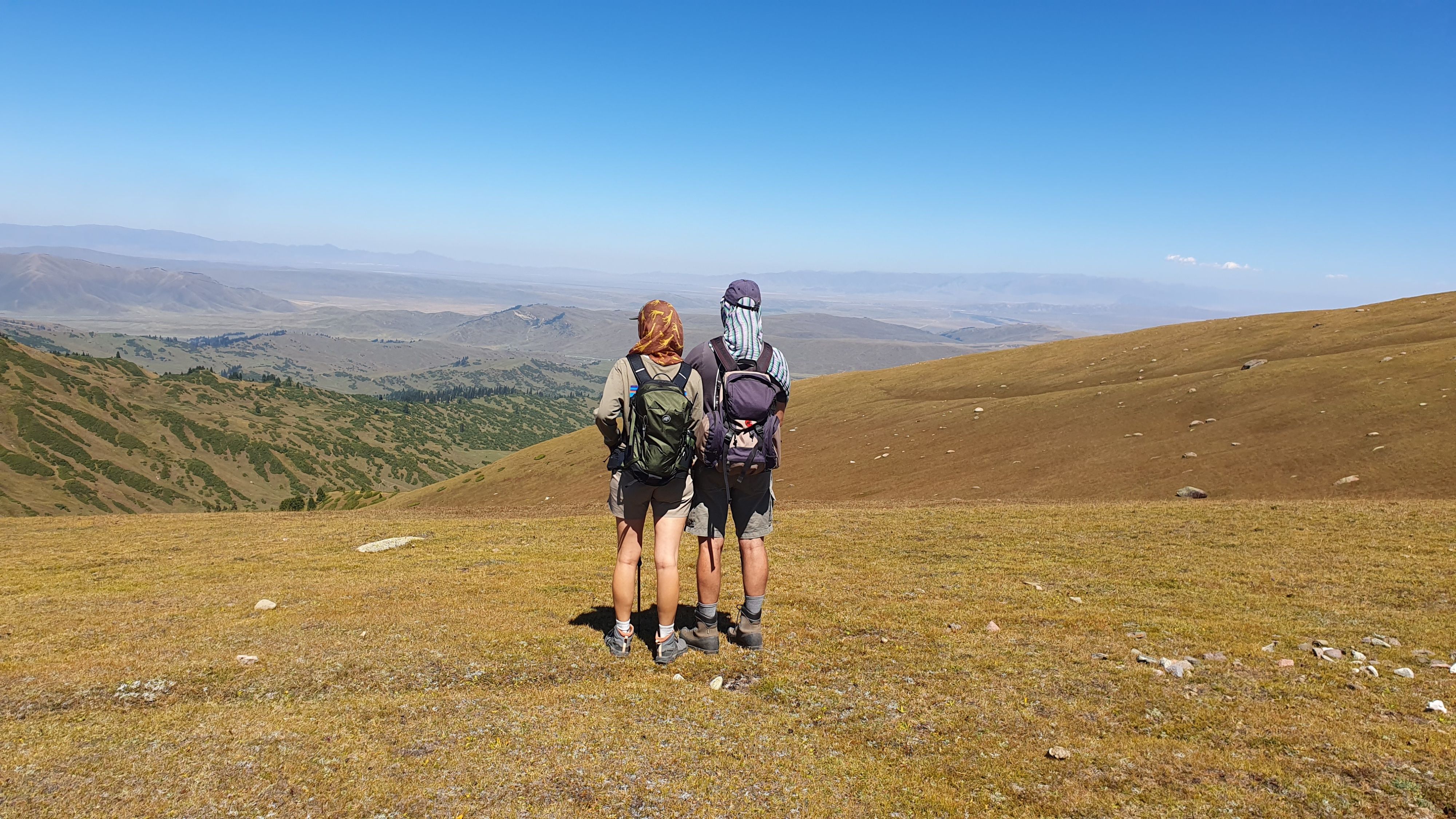 Eine Ahnung von dieser grenzenlosen Freiheit geben uns unsere Wanderungen in der spektakulären, von schneebedeckten 4000er-Gipfeln eingerahmten Vorgebirgslandschaft: Die Stecken führen scheinbar querfeldein über samtene, gelbbraune Hügel und durch grüne Täler. Hin und wieder treffen wir auf etwas wie einen Trampelpfad, einen berittenen Hirten mit Hunden, der seine Schafherde vor sich her treibt, oder einen improvisierten Blechverhau, an dem Solarpanele lehnen. Darum herum frei weidende Stuten mit ihren Fohlen.