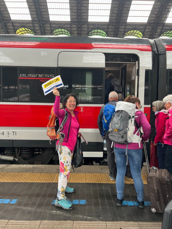Endlich stand dann die Reise vor der Türe: Seit Wochen war ich nun an der Vorbereitung – habe Buchungen entgegen nehmen dürfen, dem Hotel die Zimmereinteilung geschickt, Bahnreservationen vorgenommen, Fähren gebucht ect.. Umso neugieriger war ich natürlich auf alles, was jetzt vor mir lag. Ich hatte endlich die Möglichkeit, all das, was ich bisher nur schriftlich festgehalten und höchstens in Bildern betrachtet hatte, hautnah zu erleben. Mit prallgefülltem Reiserucksack (vielleicht habe ich doch etwas zuviel eingepackt) stand ich am Abreisetag am Perron in Arth-Goldau und wartete – bereits mit ein paar anderen Teilnehmerinnen – auf den Zug von Zürich her kommend. Schon ging die Reise los – komfortabel und mit viel Beinfreiheit in 1. Klasse – ab Richtung Mailand. Die Begrüssung mit allen TeilnehmerInnen und der Reiseleitung im Zug war herzlich. Meine anfängliche doch noch leichte Nervosität verwandelte sich schlagartig in noch grössere Vorfreude. In Mailand stand uns der erste Umstieg bevor. Unsere Reiseleitung – bestens bekannt mit dem «Gewusel» an den italienischen Grossbahnhöfen – schleust uns gekonnt und flink zum nächsten Zug.