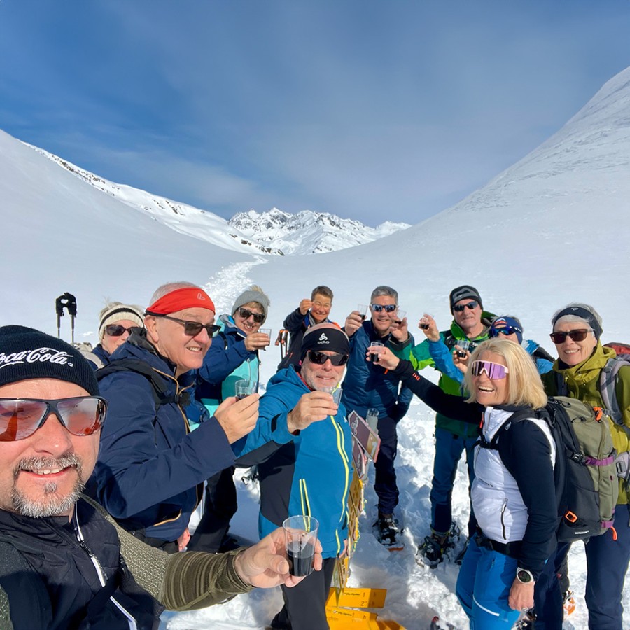 Vor dem verdienten Mittagslunch aus dem Rucksack stossen wir mit einem Glas Röteli auf das Erreichen unseres Tagesziels an. Die etwa zweieinhalb Meter hohen Wegweiser schauen noch knapp aus dem Schnee heraus. In der Ferne grüssen die bekannten Bergeller Felstürme und Kletterberge. Den Rückweg auf der gleichen Route, nun alles vorgespurt, legen wir deutlich schneller zurück. Andere Blickwinkel und