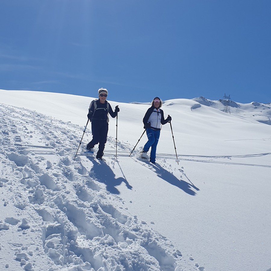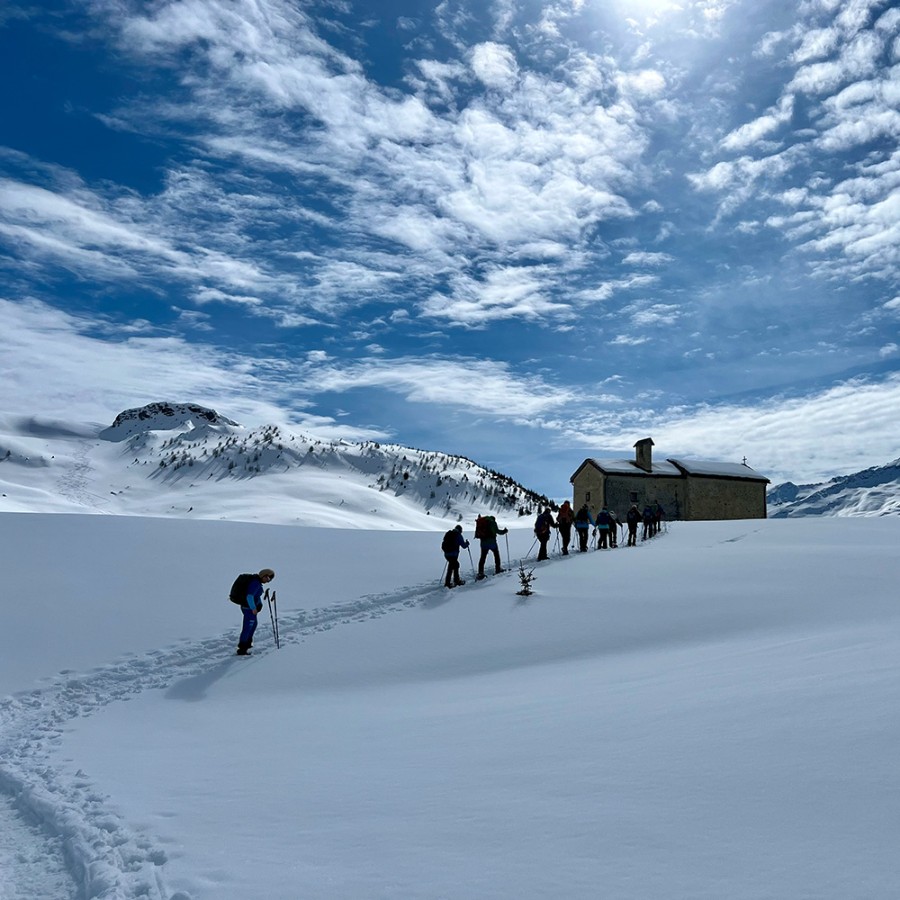 Ausgangspunkt ist Bivio, ein malerisches Bergdorf und oft als «Perle am Julier» bezeichnet. Es ist bekannt dafür, dass hier die rätoromanische, italienische und deutsche Sprachkultur aufeinandertreffen. Ein wunderbarer Morgen zeichnet sich ab. Es ist kalt und die Sonne wird noch von der imposanten Roccabella verdeckt, als sich unsere Gruppe mit Schneeschuhen und Lawinenausrüstung auf den Weg macht. Für gut eine Stunde folgen wir dem Winterwanderweg Richtung Cadval und La Motta. Begleitet werden wir von Skitourengängern, von denen die meisten die Roccabella zum Ziel haben. In den letzten Tagen hat es geschneit, und so verleiten die unberührten Schneefelder dazu, neue Spuren zu legen.