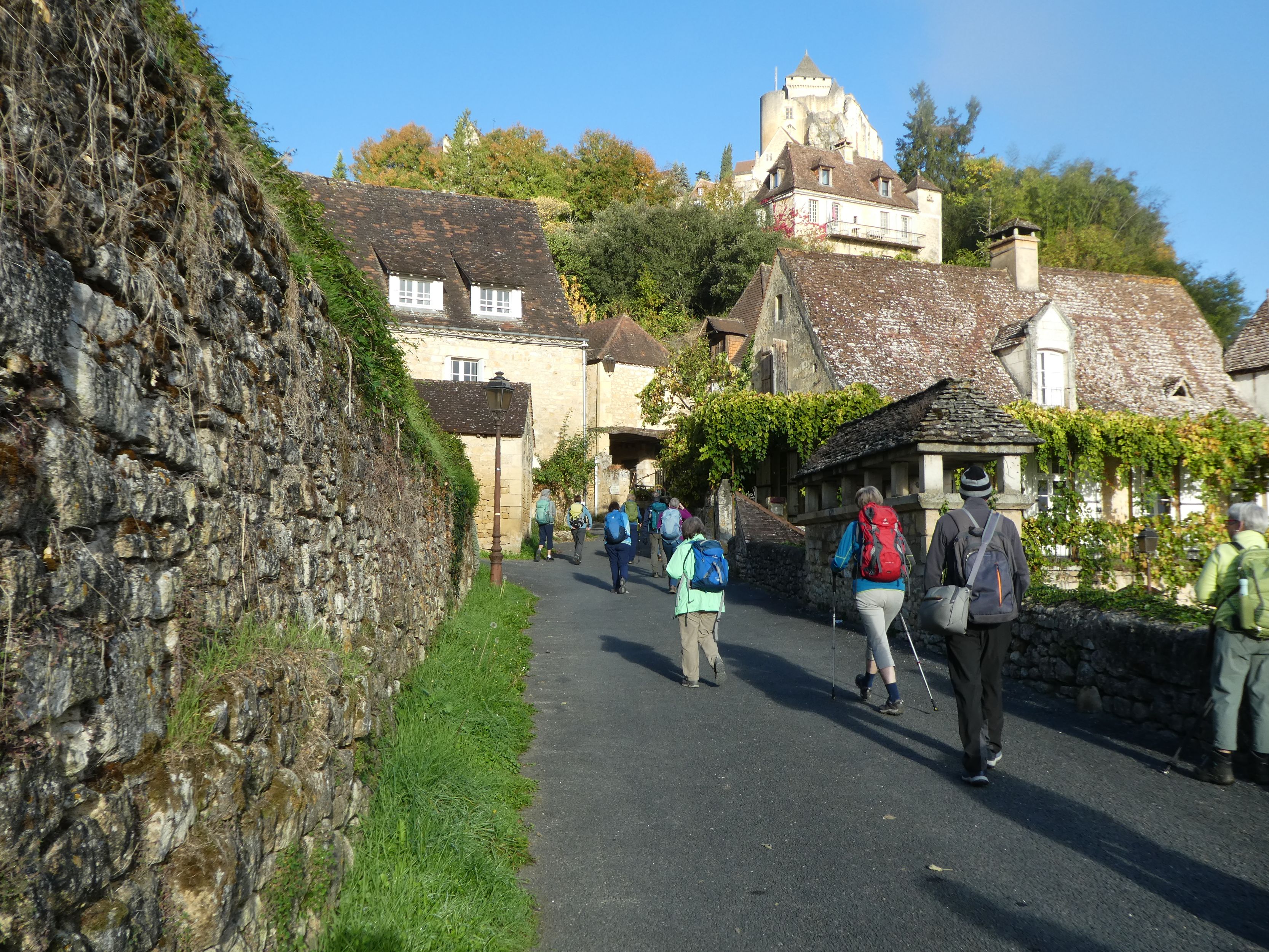 Heute seien wir prähistorisch unterwegs, erklärt uns Karin. Wir besichtigen das noch verschlafene St. Léon-sur-Vézère, bevor wir die Vézere überqueren und durch den lichtdurchfluteten Wald dem Fluss entlangwandern. Auch heute wieder dieses umwerfende Licht im Laub, auf dem samtbraunen Wasser, die Spiegelungen, die kleinen Nebelschwaden, die über dem Fluss vor sich hindampfen. Man formiert sich immer wieder neu in der Gruppe, unterhält sich bestens mit allen über alles und nichts. Zum Abschluss des Tages besichtigen wir den Roque Saint-Christophe, diesen 80m hohen und 1km langen, vom Fluss ausgewaschenen Felsen. Die natürlichen Halbhöhlen wurden schon im Jungpaläolithikum von Menschen bewohnt. Imposant und kaum vorstellbar, dass unsere Vorfahren mal so gelebt haben.