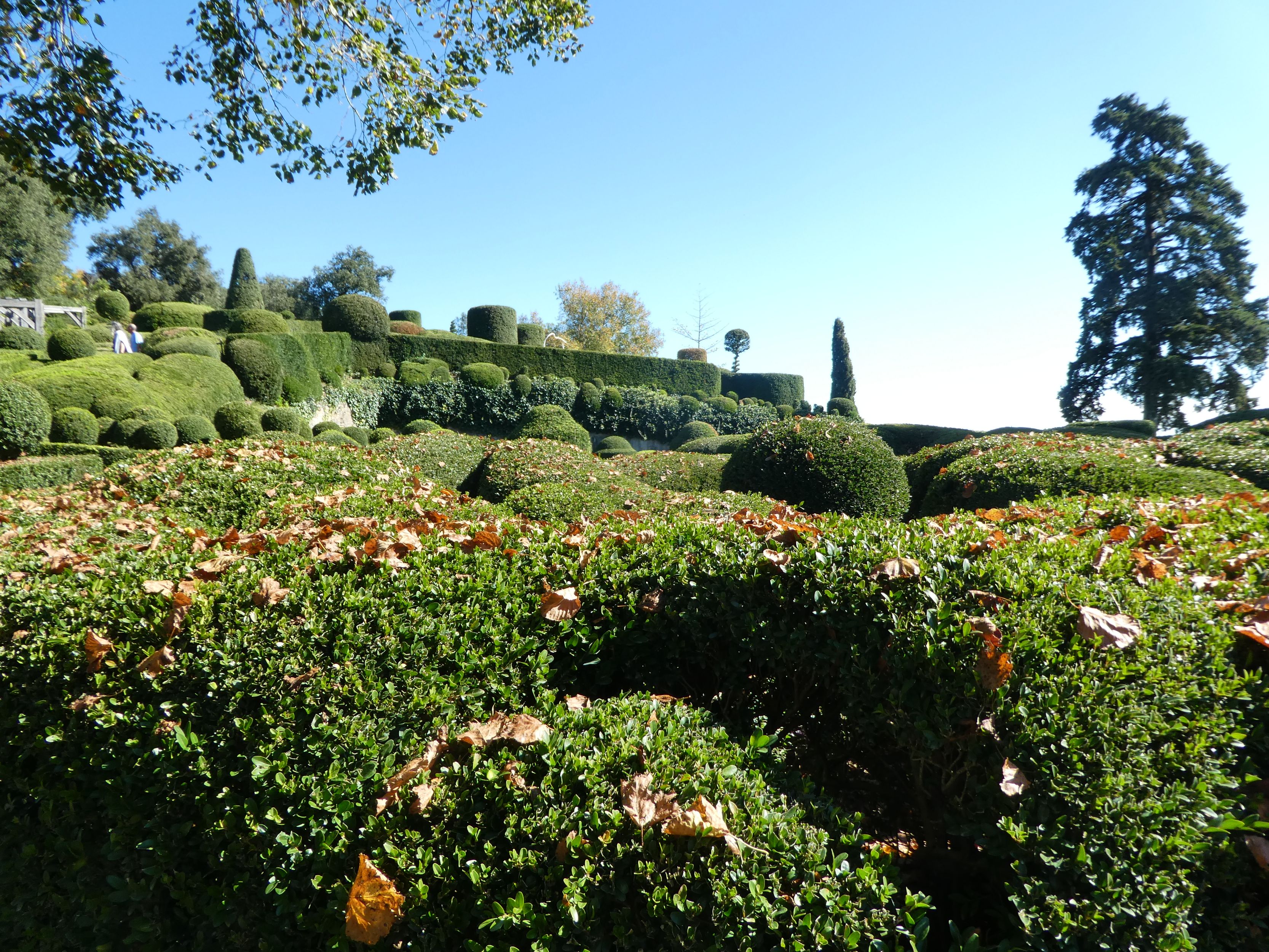 Heute werde es heiss, meint Karin und stellt unser Programm um. Wieder wandern wir der Dordogne entlang, wieder der Nebel, der uns eine Weile begleitet und begeistert, der lichte Wald, die Farben, man kann sich einfach nicht sattsehen. Mit der Sonne verschwinden Jacken und Pullover. Der Aufstieg nach Domme ist schon fast schweisstreibend, aber glücklicherweise relativ kurz. Ein hübsches, kleines Dorf, trotz sonnigem Sonntag nicht allzu überlaufen. Dann geht’s weiter in die Gärten von Marqueyssac hoch über dem Dordogne-Tal. Auf 6 km Spazierwegen kann man einerseits die verschiedenen Buchsbaumkreationen bewundern, andererseits wieder die Aussicht hinunter ins Tal. Der Abend endet mit einem Glas Vieille Prune, offeriert von Mickaël, Sie können sich mittlerweile ja wohl vorstellen, was das mit der Stimmung gemacht hat!