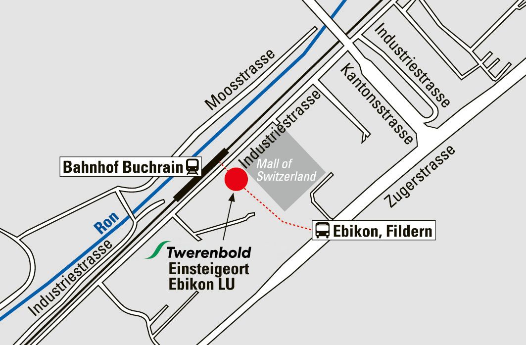 Unsere Gäste aus der Zentralschweiz können für Reisen in Richtung Süden in Ebikon LU, unmittelbar beim Bahnhof SBB Buchrain (Seite «Mall of Switzerland») einsteigen.