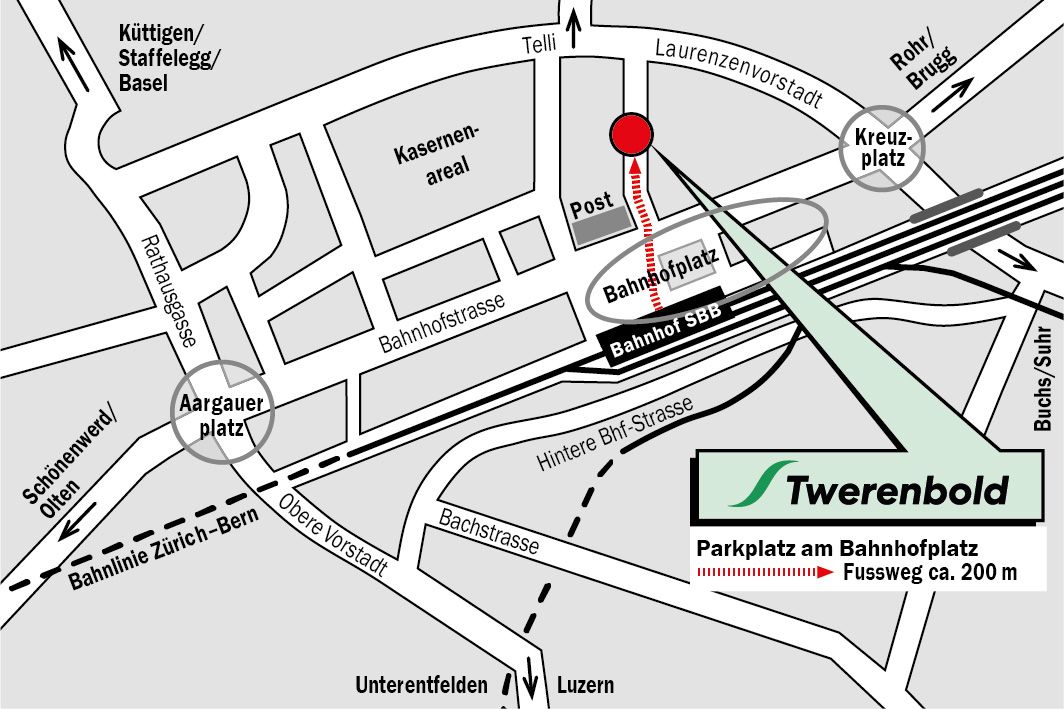 Fussweg vom Bahnhof Aarau ca. 200 Meter.