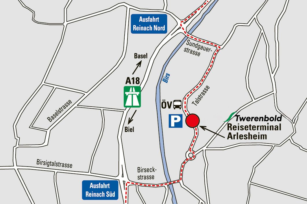 Unser Reiseterminal in der Nordwestschweiz liegt an der Talstrasse 38 in Arlesheim (BL), bei der Firma Birseck Reisen. Von Basel kommend nehmen Sie die Ausfahrt Reinach Nord und von Delémont kommend die Ausfahrt Reinach Süd.